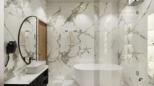 Master Bathroom shower area and vanity unit with half moon shape mirror