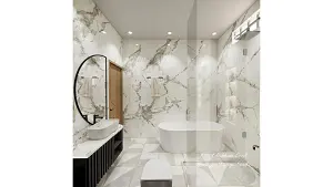 Master Bathroom shower area and vanity unit with half moon shape mirror