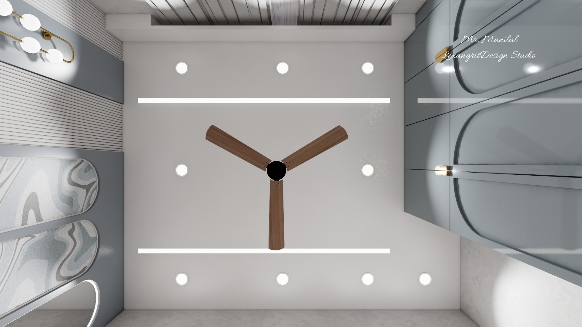 Master bedroom ceiling with pop or Gypsum board with linear profiles & recessed lights with fan in the centre
