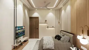 Master bedroom entrance door and showing decorative wall design (shelf, louvers panelling)