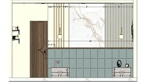 master bedroom 12 feet luxurious bedback and 2.5 feet side tables on the both side, decorative wall design 2d dimensions with PVC louvers UV marble sheet and golden strips from left to right.