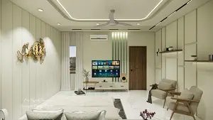 Master Bedroom showcasing luxurious bed, comfortable seating area and sleek tv unit and some open shelf