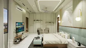Master Bedroom showing luxury bed with side table and decorative hhead board , decorative wall design,sleek tv unit