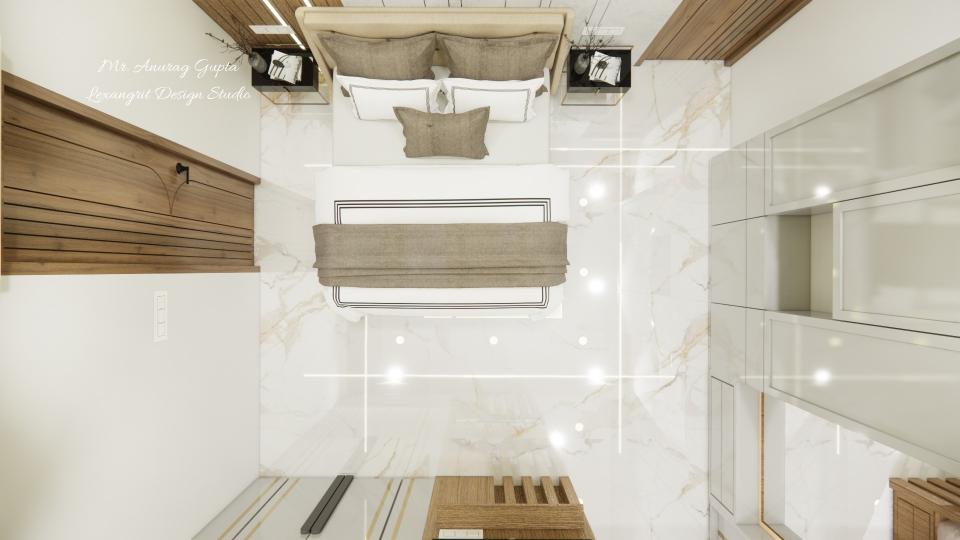Image of the master bedroom featuring a luxurious bed with a tufted headboard, bedside tables, and wardrobe against an accent wall 2d dimensions