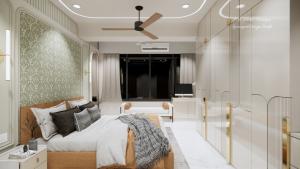 A maximalist master bedroom that ate its balcony — what was once a forgotten outdoor corner is now a plush seating area, bold wallpaper, and more room to breathe.