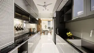 This grey modular kitchen layout features a functional sink unit with water purifier and dustbin below, a three-drawer utensil storage section, shelf unit, pantry pull-out, and fridge placement. Wall cabinets include a GTPT unit and open shelves, while overhead loft cabinets provide additional storage for better kitchen organization.