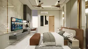Modern master bedroom wardrobe with golden strip detailing, integrated TV unit, and study table for a sleek, functional interior design.