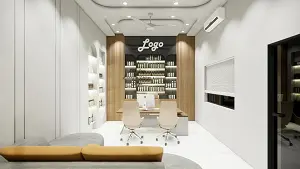 Perfume manufacturer office interior with product display in black niche, boss cabin back wall design with table and chairs