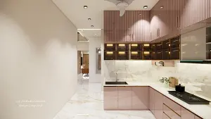 This stunning U-shaped modular kitchen features a vibrant pink high-gloss acrylic finish that brightens the entire space. Designed for maximum efficiency, it includes a spacious 3-drawer unit for cutlery and utensils, a dedicated bottle pull-out for organized pantry items, a G-tray (GTPT) unit for tall jars and containers, and a charming wicker basket unit for a touch of texture while storing fruits or vegetables. A perfect blend of modern aesthetics and smart functionality.