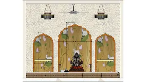 Pooja room measurement layout showing marble platform dimensions, wall panel design with lotus artwork, and pooja room front wall detailing for accurate puja ghar planning.