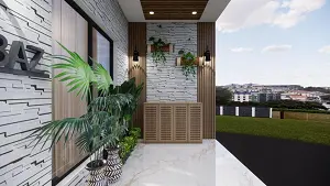 Porch area design with shoe unit, decorative stone cladding wall and wooden louvers in a modern home entryway