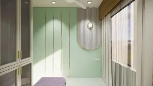 Puja room showing decorative wall design with golden strip highlights