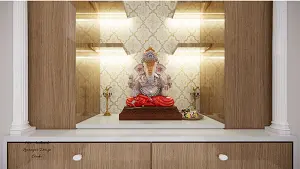 Front view of a pooja mandir CNC design featuring a wooden mandir with intricate CNC jali cutting and door — creating an elegant and devotional centerpiece for modern home interiors.