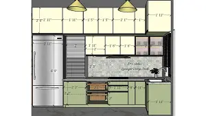 2D full wall elevation drawing of sage olive green L shaped modular kitchen showing all units including tambour, wicker basket, 3 drawer, bottle pull out, corner, sink and GTPT unit with exact dimensions by Lexangrit Design Studio