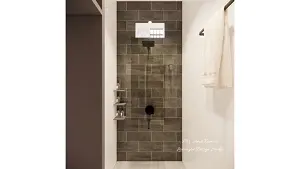 Bathroom view with a dark grey tiled wall and matte black accessories.