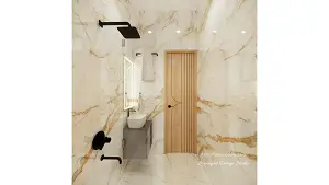 After entrance bathroom showing vanity unit with mirror  & shower area