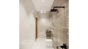 Modern bathroom attached toilet design showcasing a compact bedroom washroom with dry and wet area separation, frameless round mirror vanity, wash commode, and elegant designer wall tiles.