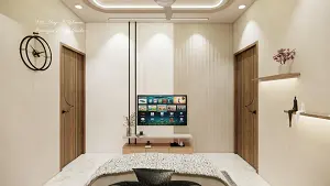 Sleek tv unit and WPC louvers back wall front of luxurious bed