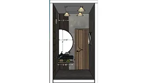 2D measurement drawing of attached toilet bathroom wall layout showing vanity placement on the toilet door entrance wall and wet and dry bathroom area dimensions.