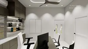 Modern small office interior with plain wall, concealed wall almirah and entrance wall design, minimal and budget-friendly office cabin layout.