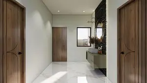 Small passage and showing vanity unit with decorative mirror
