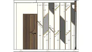Detailed 2D drawing of a living room sofa back wall panel design showing accurate measurements, CNC-cut panel layout and golden strip pattern used for executing a modern interior sofa back wall design.