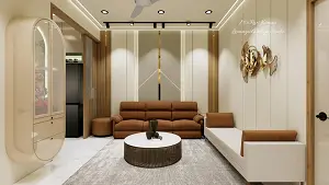 A view of the living room featuring a cream laminate sofa back wall with grooves and wooden texture ornamented by golden patti, a brown three-seater sofa with a coffee table on a grey mat, a cream sofa backed by a beige textured wall with a gold mural, and a cream puja unit on the left.