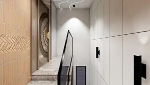 A view of the staircase from the marble landing showing an orange-tiled wall with a CNC cut detailed wooden door with a circular radial design on the left, a black-framed glass railing in the center, a white paneled wall with black vertical lighting on the right, and a ceiling featuring wavy recessed LED light strips.