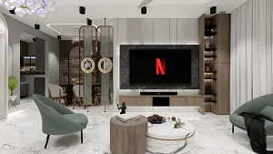 it is a side of a living room design having a tv unit with smt or umt black marbel laminated paneling in the back og the tv and wall is designed in a groove cutting cemented textured wall, and left side a matt wooden laminated vertical storage unit having open and closed units, and below the tv a matt wooden laminated floating vanity unit. in the right a golden ss fluted glass separator, separating living and dinning