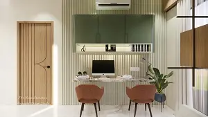 Study area showing two decorative chair and some book storage with white louvers panelling design
