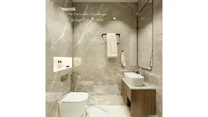 This is a parents bathroom,here we can see wall tiles with italian marble grey finish,towel hanger,left wall we've placed WC with niche and on right wall we've given counter top wash basin with WPC vanity unit .