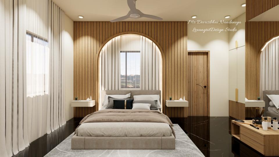 A guest bedroom interior featuring an arch-design wooden rafter accent wall in laminate finish, central bed with beige glossy side tables, custom carpet, black Italian marble glossy flooring, long beige blackout curtains, wardrobe and dressing unit for a modern elegant look.