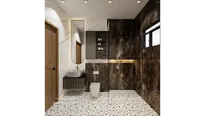 Toilet after entrance showing shower area & wc, vanity unit with mirror