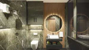 Toilet front view showing vanity unit back side louvers panelling with round shape mirror and some storage
