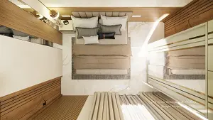 Bedroom after entrance showing luxurious bed and designing wardrobe