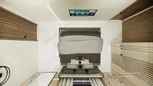 Bedroom showing luxury bed and decorative wardrobe,large mirror with louvers panelling design