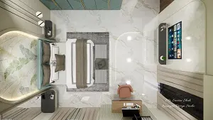 Showing luxury bed with two side table & decorative headboard wall design with large mirror