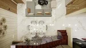 Dining areea frontt of the staircase & decorative wall panelling design,basin unit
