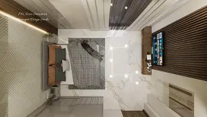 After entrance master bedroom showing sliding wardrobe & sleek tv unit with some storage,back wall louvers panelling design