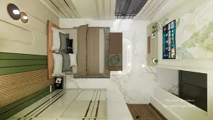 Bedroom showing luxurious bed with side table, headboard wall louvers panelling design & sliding wardrobe