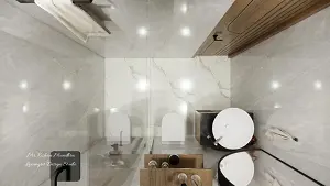 toillet design with light slate glossy tiles, seperated in dry and wet area. Dry area has a hanging vanity and white bowl sink and half moon mirror. Next to that a wc and in the wall 2 shelves are hanged and then wet area for shower