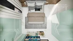 Bedroom showing luxurious bed, sleek tv unit with back side wall design & sliding wardrobe