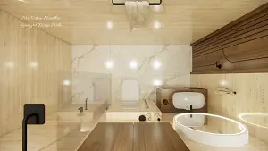 Toilet front view and showing vanity unit with round shape mirror,wc area,some storage, shower area