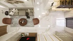 Living area showcasing seating area front of decorative center table,sofa back side decorative wall and  crockery unit