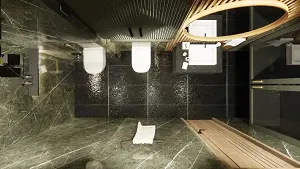 Toilet front view showing vanity unit back side louvers panelling with round shape mirror and some storage
