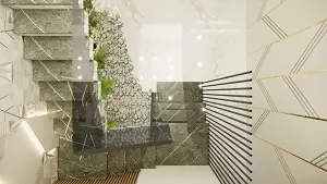 Top view of staircase with dark grey Italian marble, glass railing, and black rod balustrade, featuring an indoor pebble dry garden and triangular textured wall panels with gold accents.