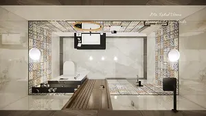 Luxury toilet with hanging wc, hanging sink unit with a white sink, a shower area and glass separatot, walls are contunious moroccan tiles in the middle