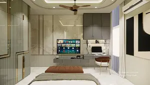 Modern master bedroom wardrobe with golden strip detailing, integrated TV unit, and study table for a sleek, functional interior design.