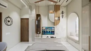 Tv unit with hdhmr duco finish or laminate, combination of open &closed shelves with wallpaper on the background, window seating on right.