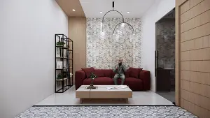 Reception area of a real estate office featuring a Korean-theme wooden wall design from wall to desk, black-and-white marble laminate reception counter with veneer finishes, designer tile flooring, continued back-wall detailing and strategically placed lighting for a modern professional look.